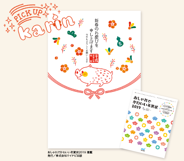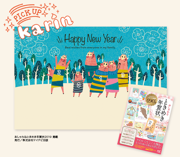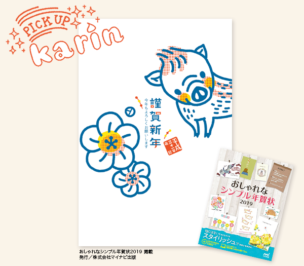 平成の年越しができる最後の年に3冊に掲載していただける事になりました。これもkarinの年賀状を新年のご挨拶に選んでいただいている皆さんのおかげです。ありがとうございます。 今年もどこか暖かく、どこかなつかしいkarinらしいお絵描きが満載です。是非手にとってご覧いただければと思います。